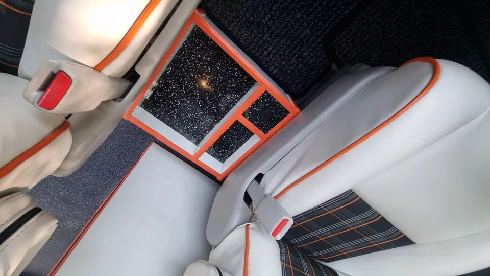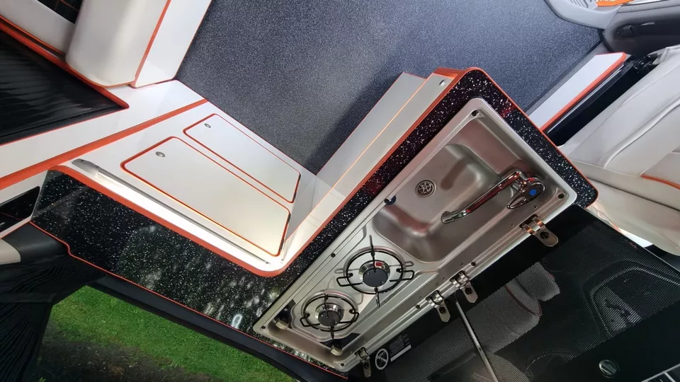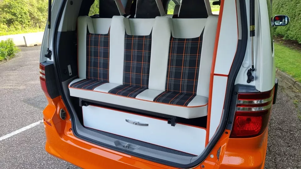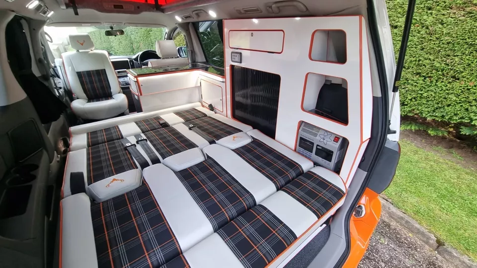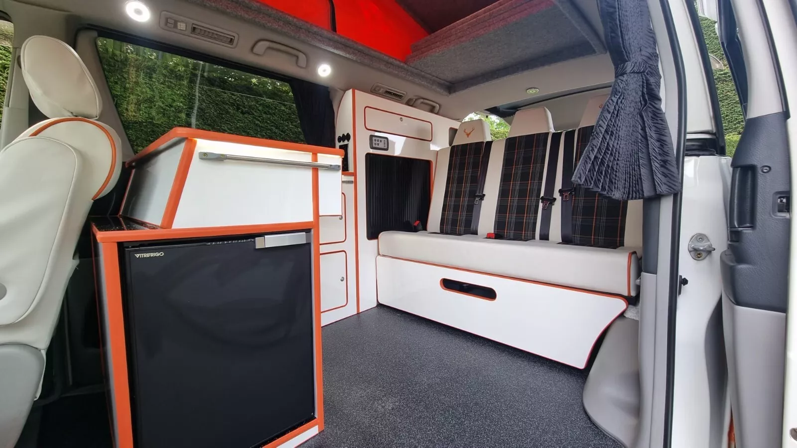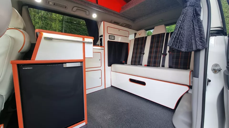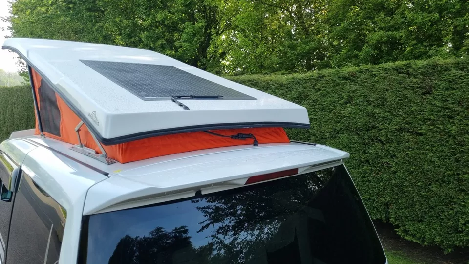 CAMPERVAN CONVERSION INCLUDES A COLOUR CODED DRIVELODGE POP TOP ROOF WITH MATCHING ORANGE CANVAS , WITH BED BOARDS, 3 ZIPPED WINDOWS AND TWO LED LIGHTS.