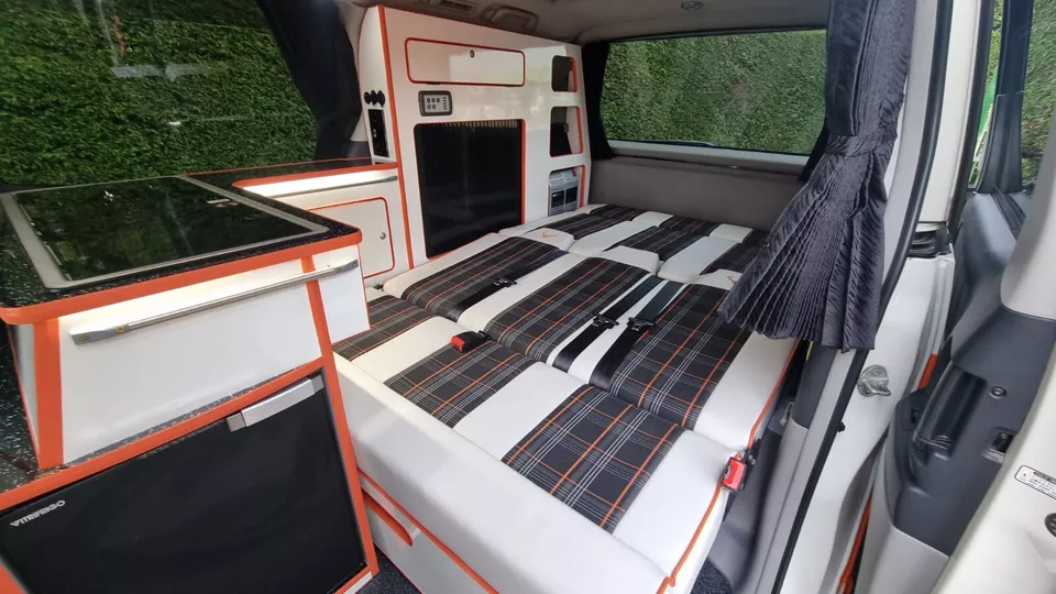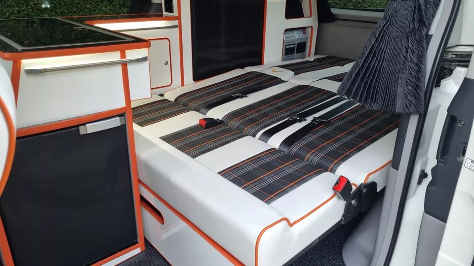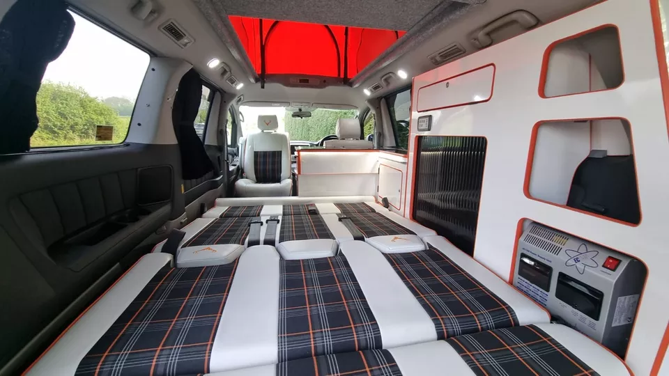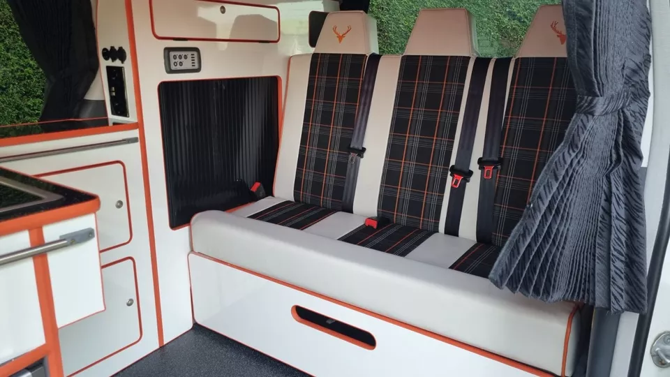 A STREAMLINE 48 INCH WIDE ROCK N ROLL BED WITH THREE SEAT BELTS, UPHOLSTERED IN LIGHT GREY IN RETRO TARTAN CENTRE PANELS WITH THE FRONT SEATS UPHOLSTERED TO MATCH WITH OUR ANTLER LOGO ON THE HEADRESTS.