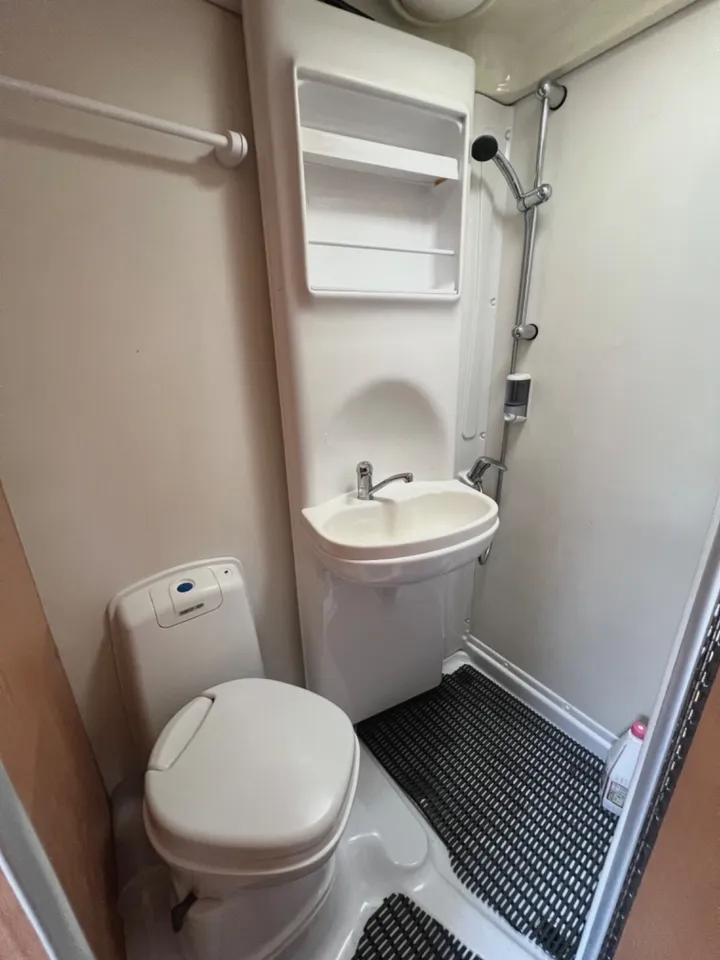The shower with good flow of hot water from an easily adjustable showerhead with large capacity water and waste tanks.