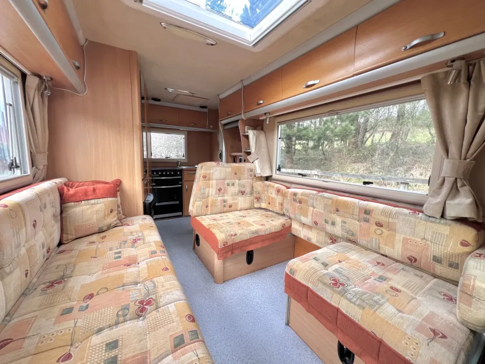 The lounge feels bright and airy with a large settee and opposing l-shape settee, large panoramic windows either side with an Heiki roof light and free standing dining table which stores away neatly in the wardrobe.