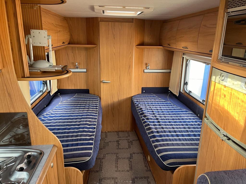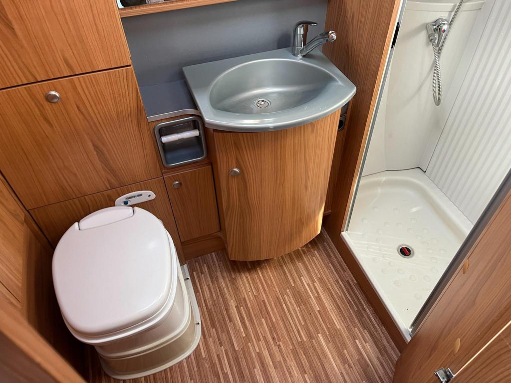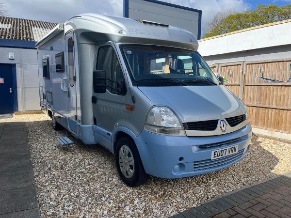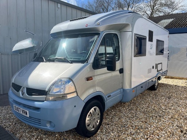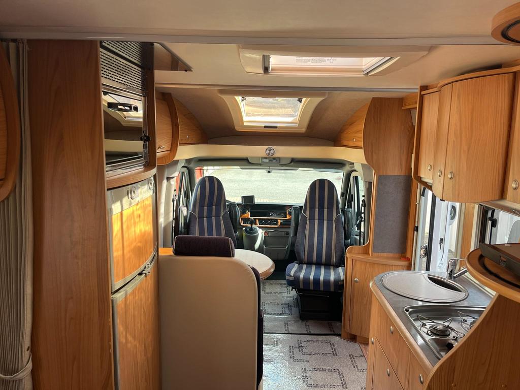 Rare opportunity to buy a well made, Left Hand Drive Automatic, perfect for continental cruising! Finished outside in an attractive combination of Silver and Sky Blue, the Delfin T 700 boasts a roomy, modern looking interior, which features a sociable front dinette area, well equipped central kitchen, with two fixed single beds to the rear, leading to a superb full width rear washroom.