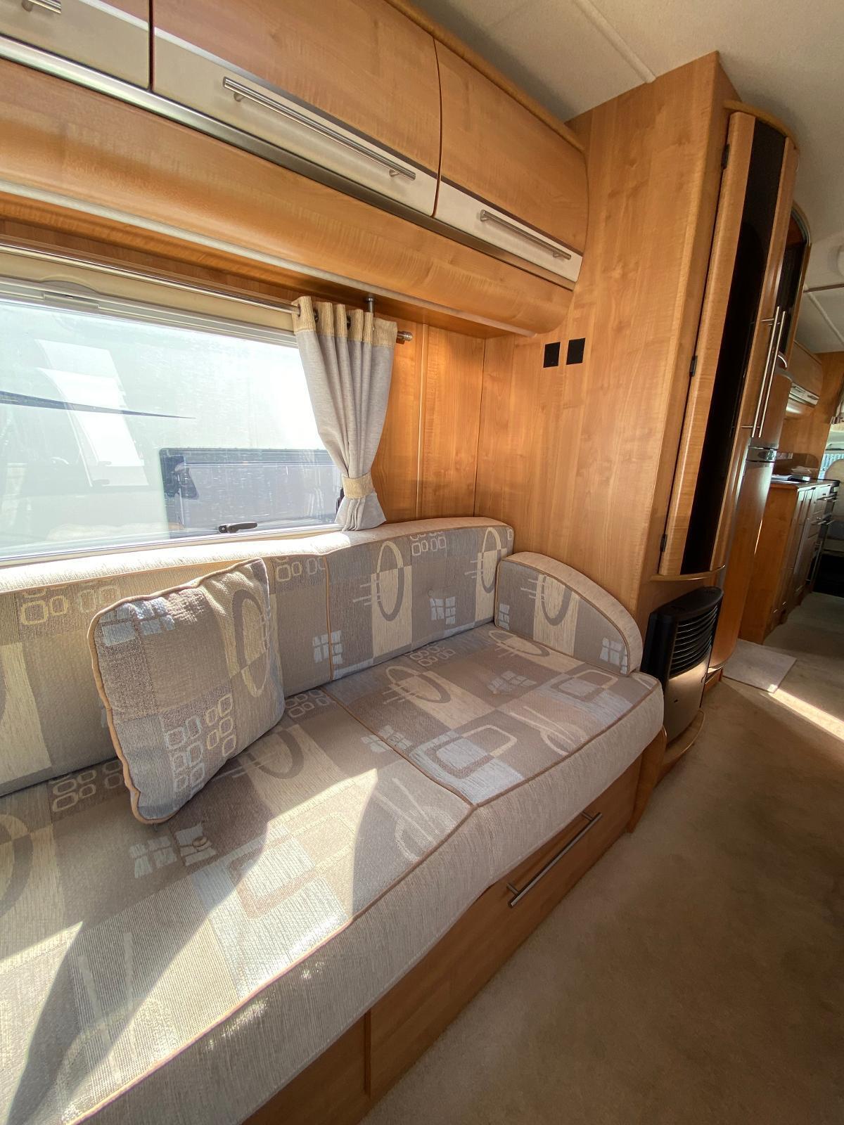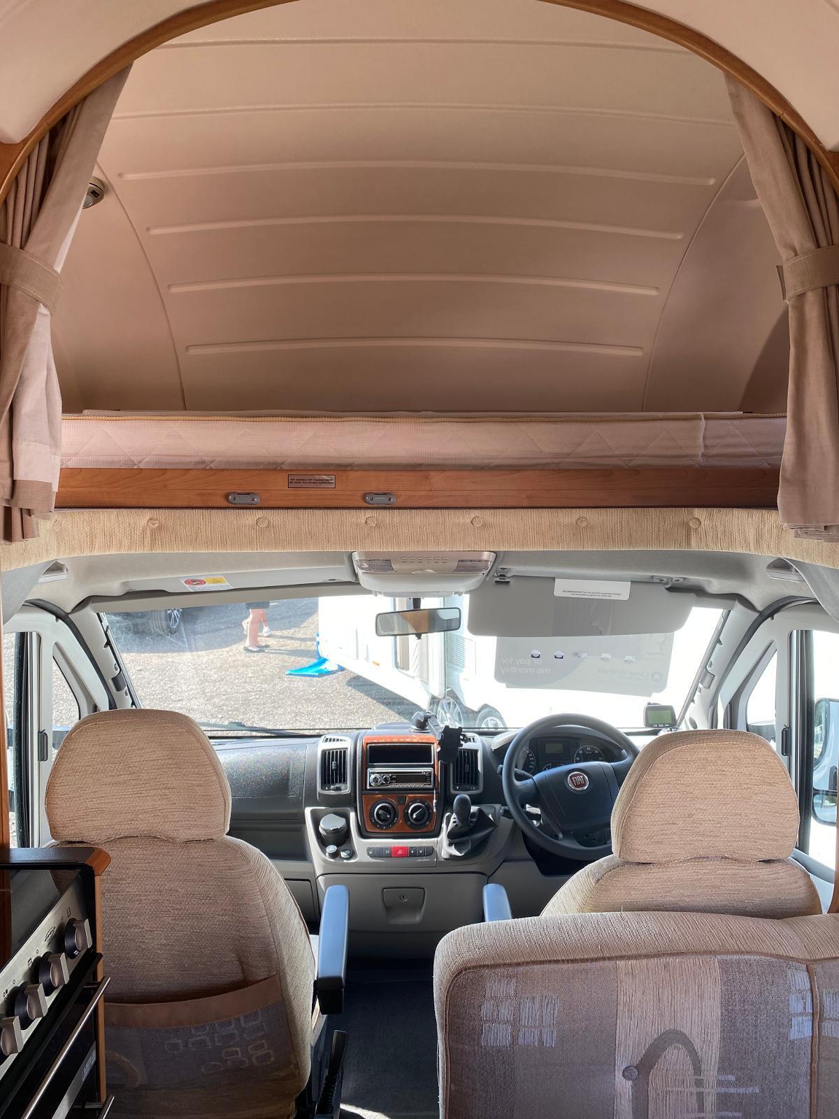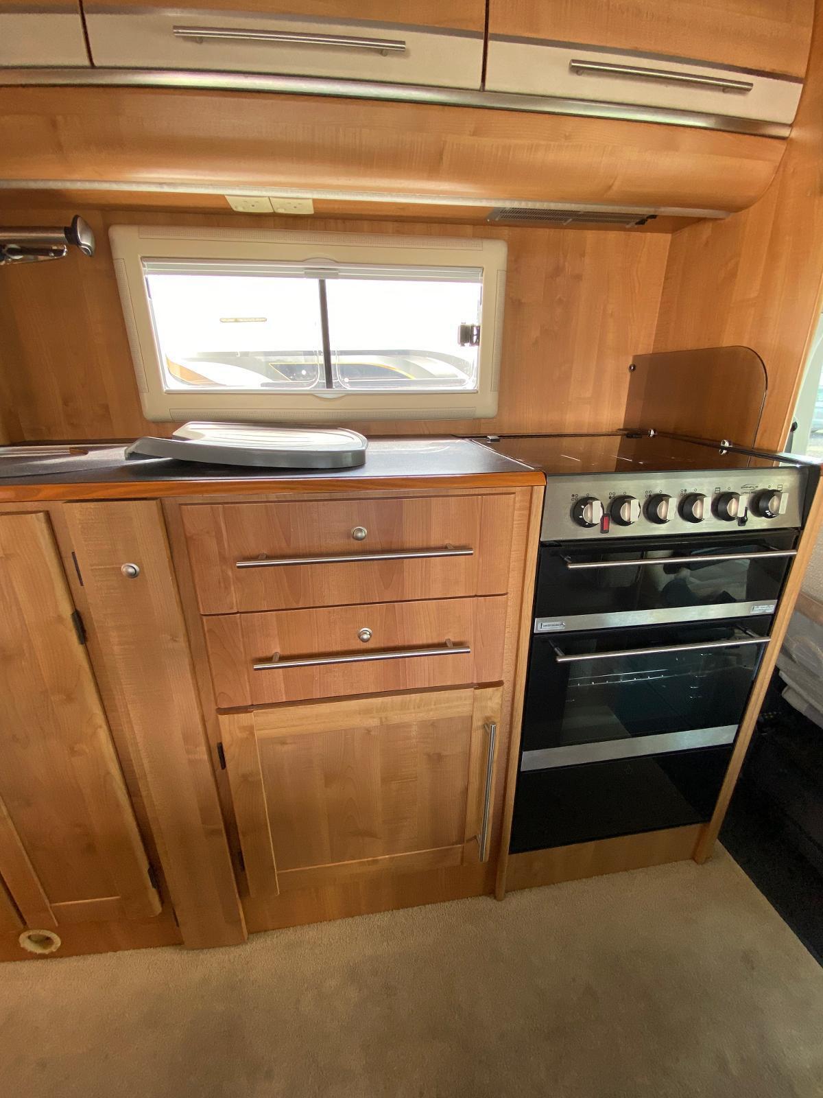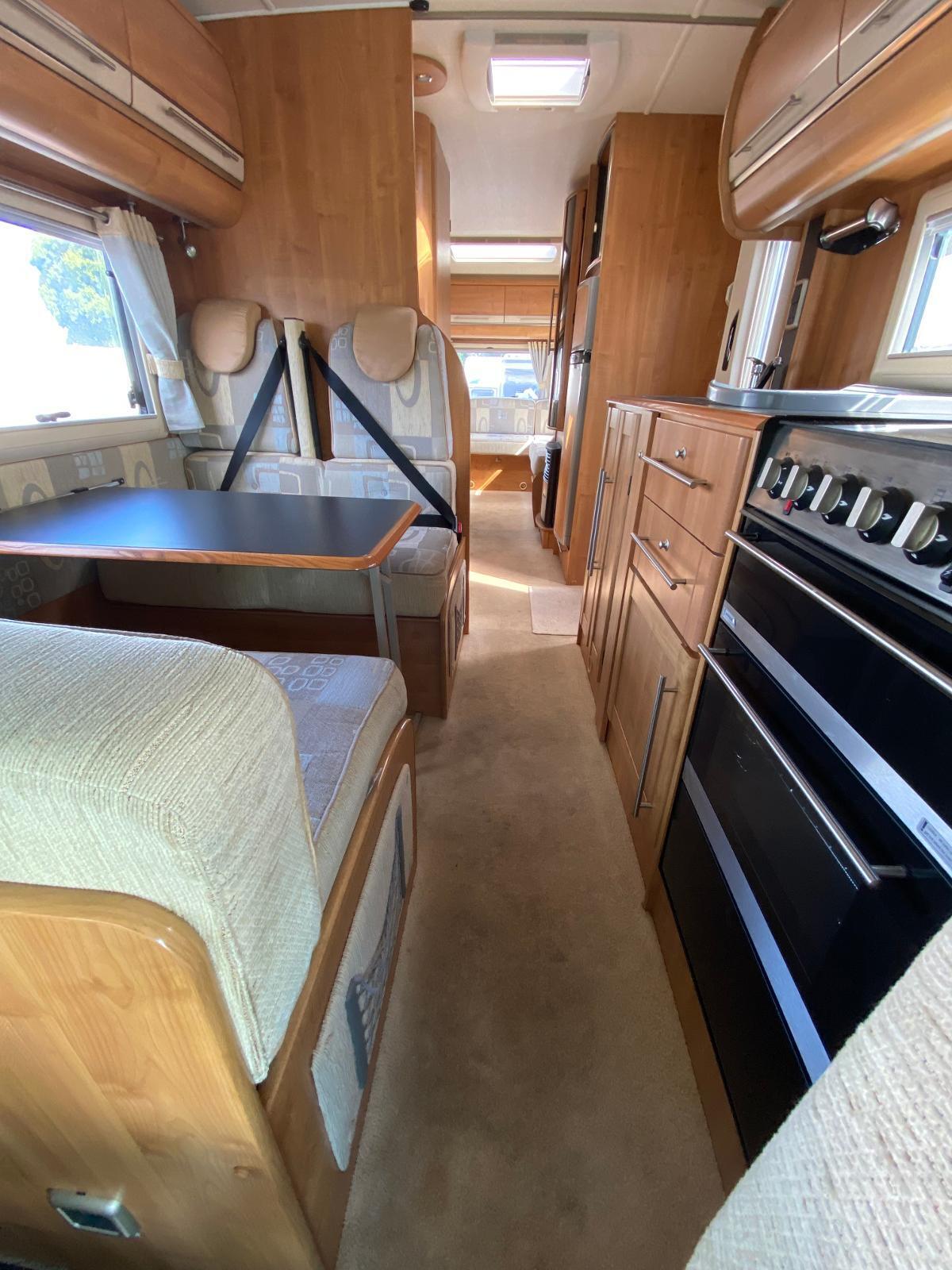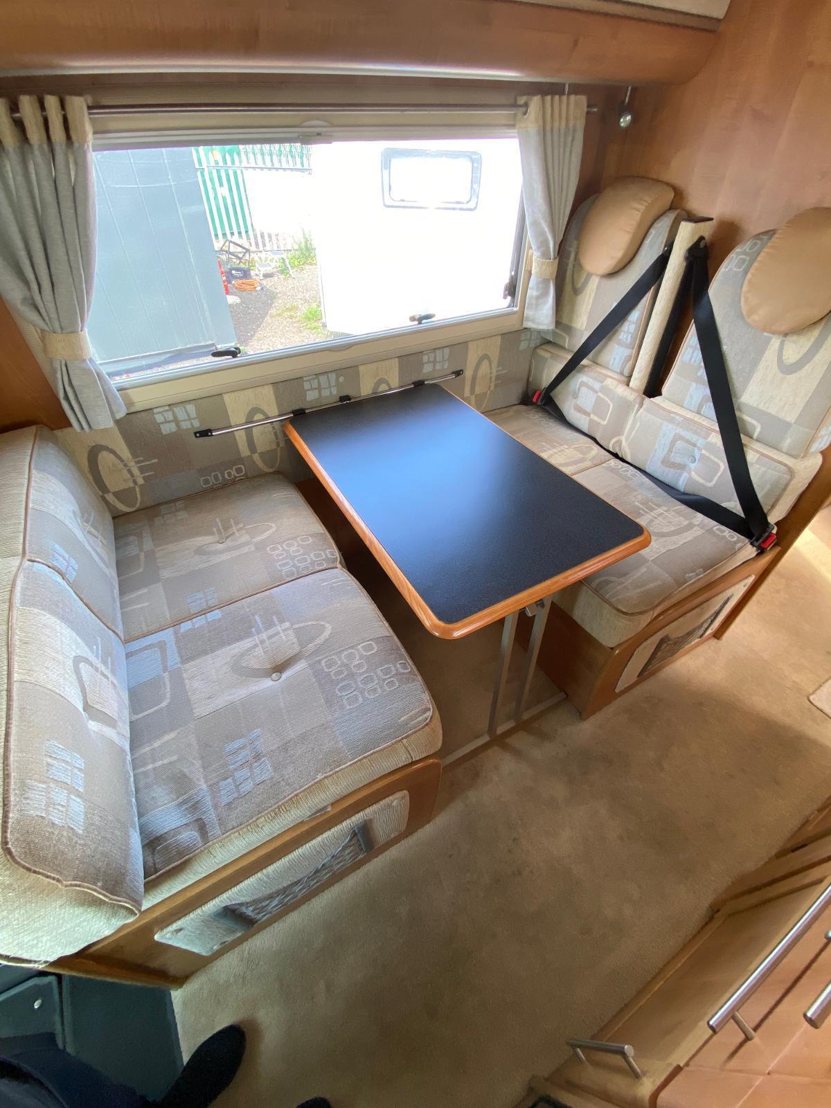 This is a 6 berth motorhome with U-shaped seating, side dinette and over-cab bed. The kitchen has a hob with 3 gas rings and 1 electric plate, sink, oven, grill, microwave and large fridge freezer. Opposite the kitchen is the side dinette which can be converted into a double bed. The rear of the motorhome is the U-shaped lounge which can also convert into a double bed. The central washroom has a cassette style toilet, hand wash basin and shower. This motorhome has blown air heating and plenty of storage for all your needs.