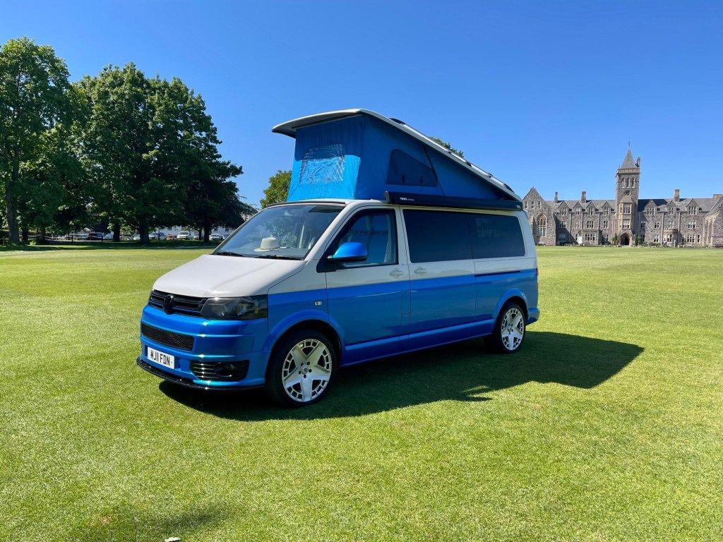 “Levante” high-end conversion with electric elevating roof in Electric Blue/Candy White.