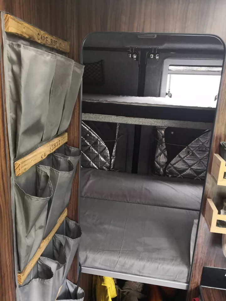 Double drop down bed, rear double and single bunks with large garage below ( 2x MTB ) . Front double and single swivel leather seats, 2 rear leather seats, shower and toilet. Fully winterised ( Alps down to -15’c no problem )with the best of kit fitted throughout.