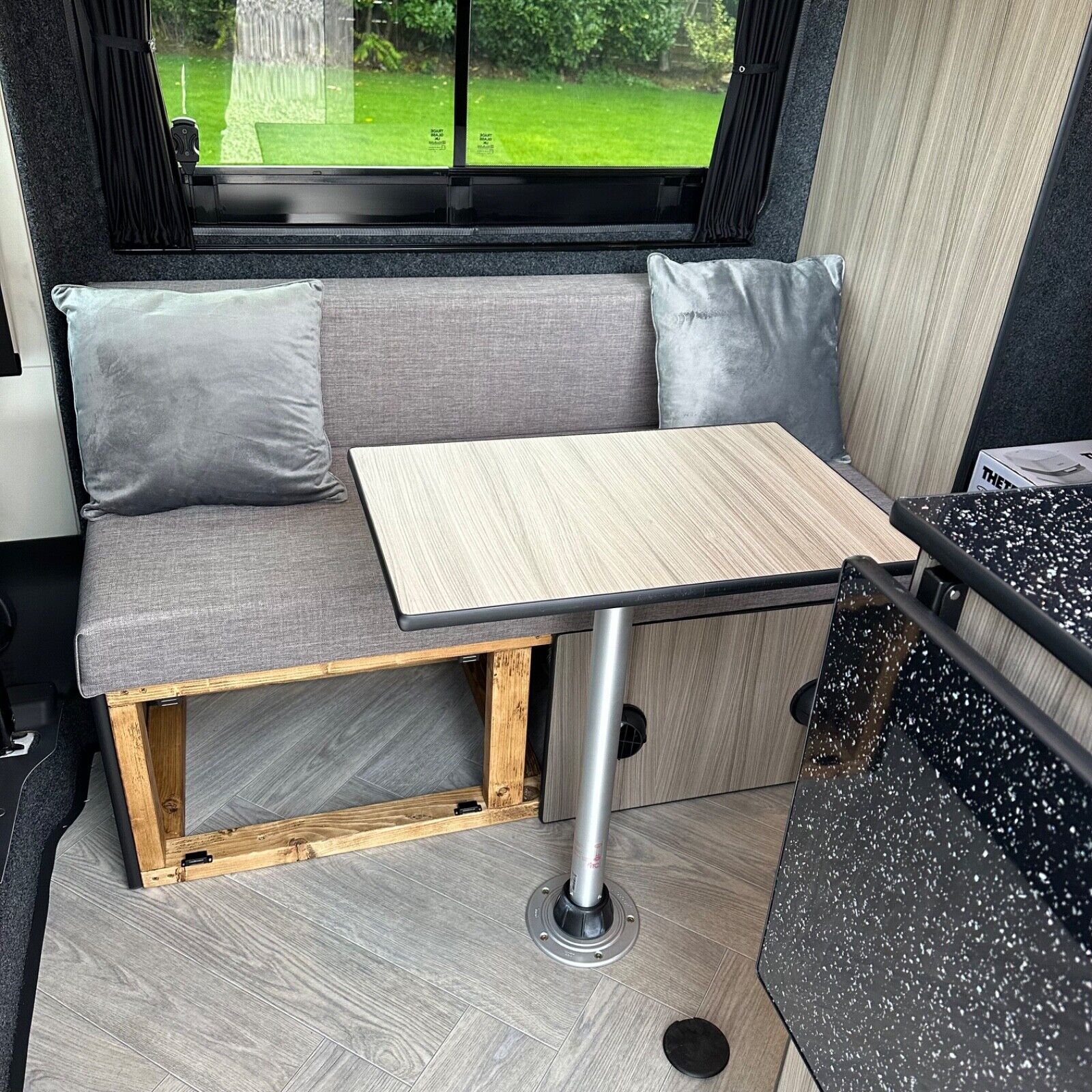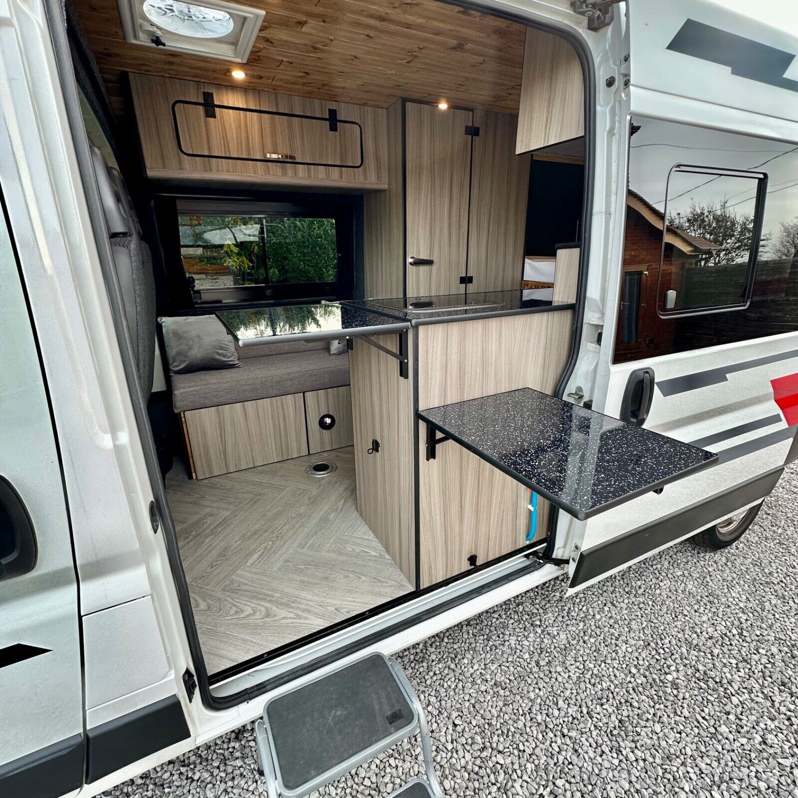 Two pop-up tables: one inside the kitchen for workspace, one at the front for outdoor use.