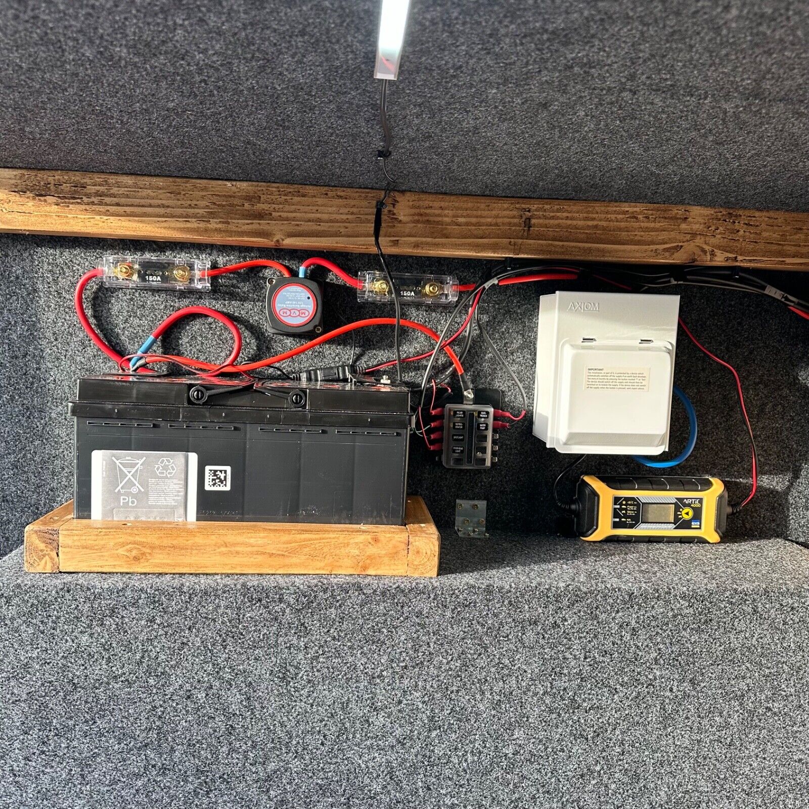 Large leisure battery with split-charge relay system and 12V charger for campsite use.