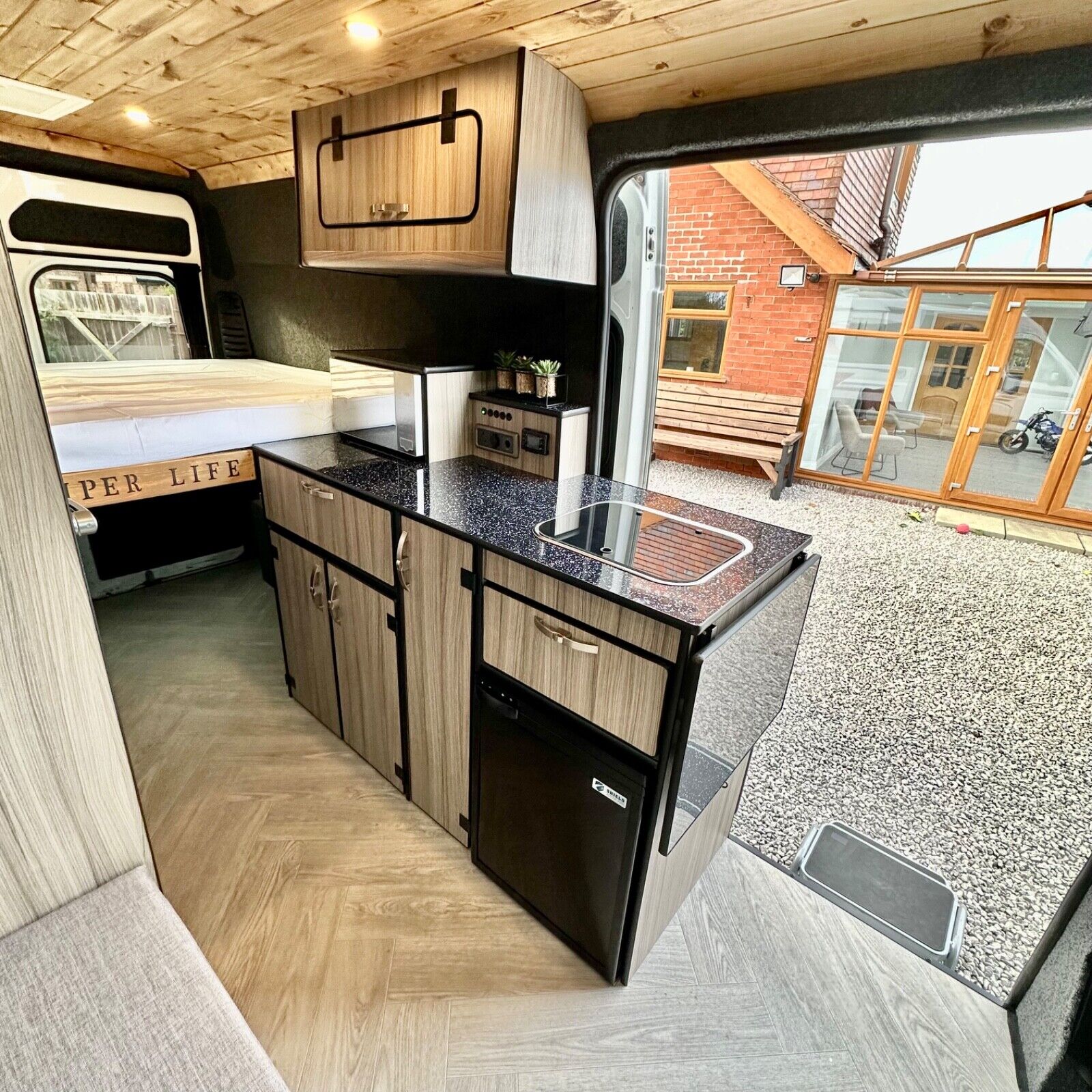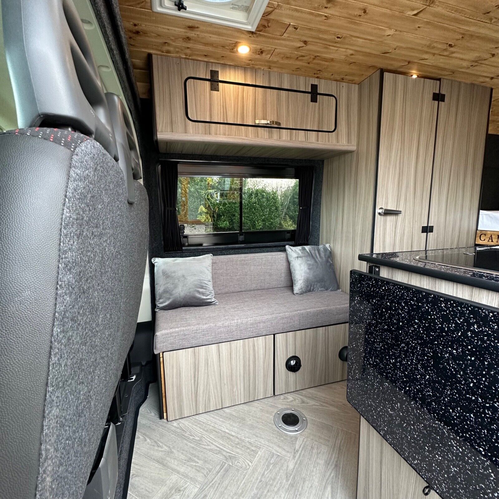 Wood-effect ceiling with two skylights; one fitted with a large fan with in/out function, electric open/close, rain sensor, and remote.